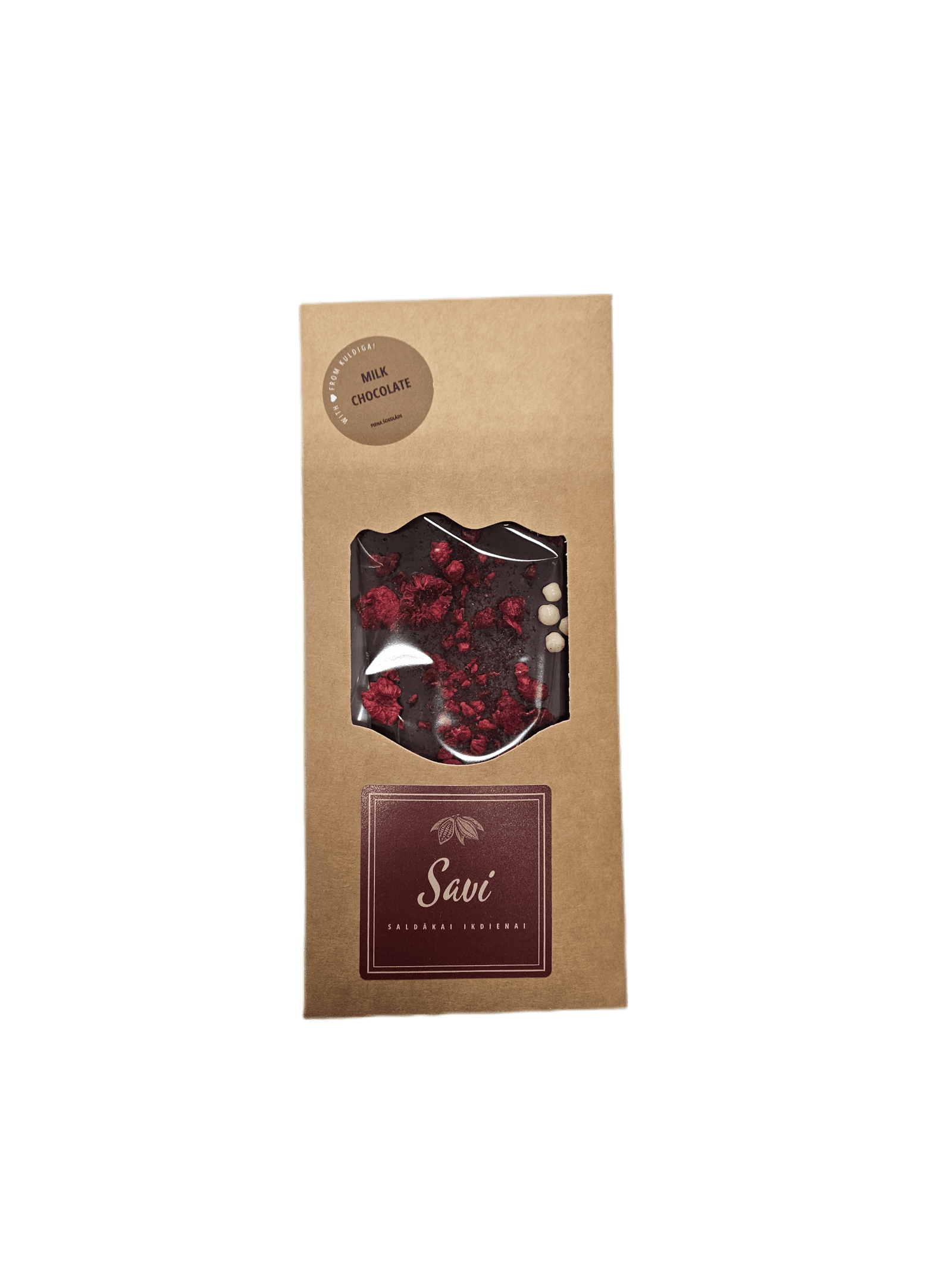 Sastāvdaļas: piena šokolāde98,7%(Beļģija)(cukurs, kakao sviests, kakao masa, pilnPIENA pulveris, dabīgas vaniļas aromatizētājs. Kakao saturs vismaz 35%), sublimētas avenes1%, baltās šokolādes pērlītes opāls(cukurs, rīsu milti, kakao sviests, pilnPIENA pulveris, LAKTOZE, vājPIENA pulveris, emulgators: E322 (SOJAS lecitīns), sāls, glazētājviela: E904 (šellaka), ciete, glikozes sīrups).Enerģētiskā vērtība 2333 kJ/ 559 kcal,tauki 35 g- tostarp piesātinātās taukskābes 21,4g,ogļhidrāti 53,1 g- tostarp cukuri 52,2 g,šķiedrvielas 1,9 g,olbaltumvielas 6,9 g,sāls 0 g. Uzglabāt: +5 līdz+20,ne tiešos saules staros. Ieteicams līdz:uz iepakojuma. NETO 70(+/-5 g).
