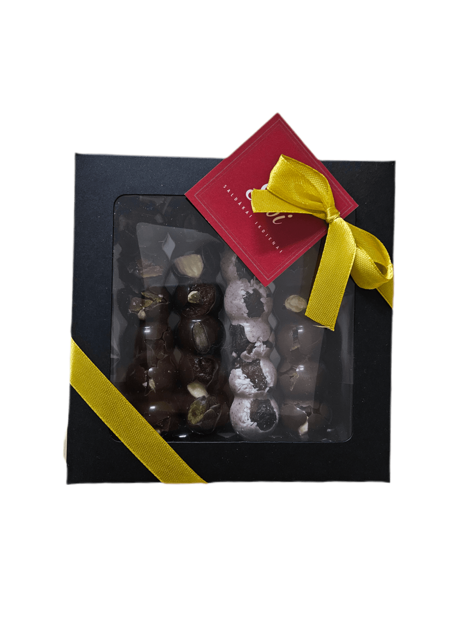 Sastāvā: tumšā šokolādes 55%(Beļģija)(kakao masa,cukurs,kakao sviests, emulgators- SOJAS lecitīns,dabīgs vaniļas aromatizētājs.Kakao saturs nav mazāks par 55%), dzērveņu sukādes (dzērvenes, cukurs, saulespuķu eļļa), MANDELES, ķirbju sēklas. 100 gr.produkts satur: enerģētiskā vērtība 1655kj/ 393kcal, tauki 15,1, tostarp piesātinātās taukskābes 5,78, ogļhidrāti 57,08, tostarp cukuri 49,44, olbaltumvielas 4,64, sāls 0,1.