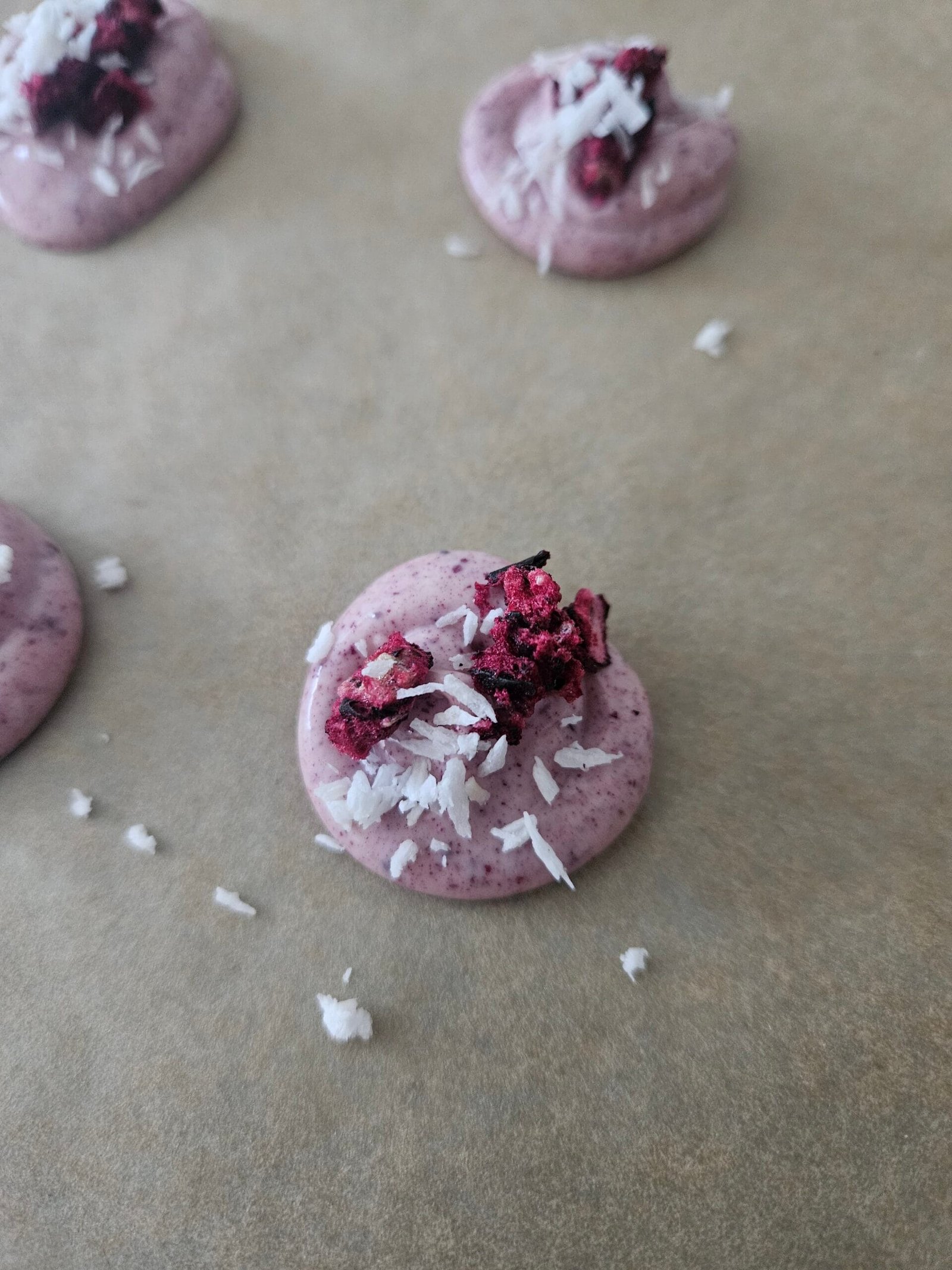 Sastāvā: Baltā šokolāde 85%(Beļģija)((cukurs, kakao sviests, pilnPIENA pulveris, emulgators: SOJAS lecitīns (E322), dabīgs vaniļas aromatizētājs., kakao saturs vismaz 30%), sublimētas upenes, kokosriekstu skaidiņas, dabiska krāsviela-biete. Uzturvērtība:100 g produkts satur: Enerģētiskā vērtība 2401 kJ / 575 kcal, tauki 37,1 g- tostarp piesātinātās taukskābes 22,5 g, ogļhidrāti 54,4 g- tostarp cukuri 54,4 g, olbaltumvielas 6,2 g, sāls 0,22 g.